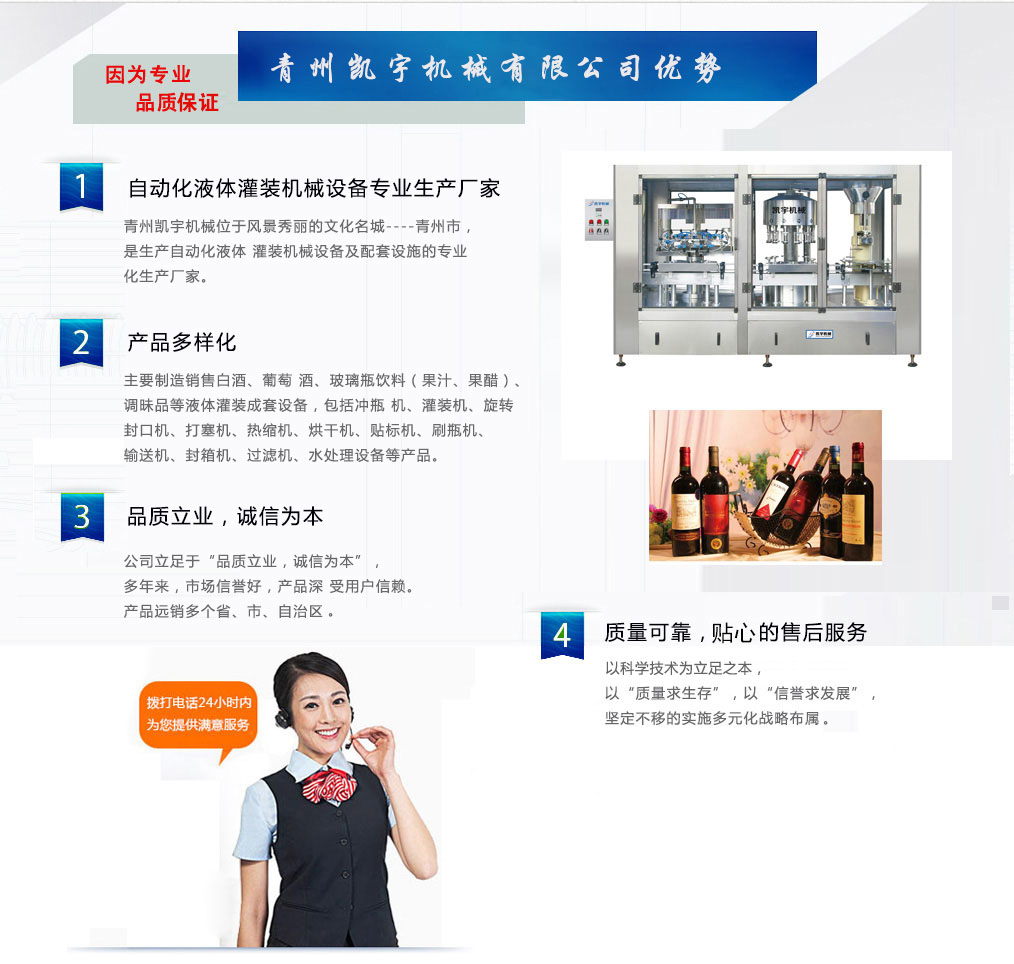 青州凯宇机械位于风景秀丽的文化名城~青州市,是生产自动化液体 灌装机械设备及配套设施的专业化生产厂家。